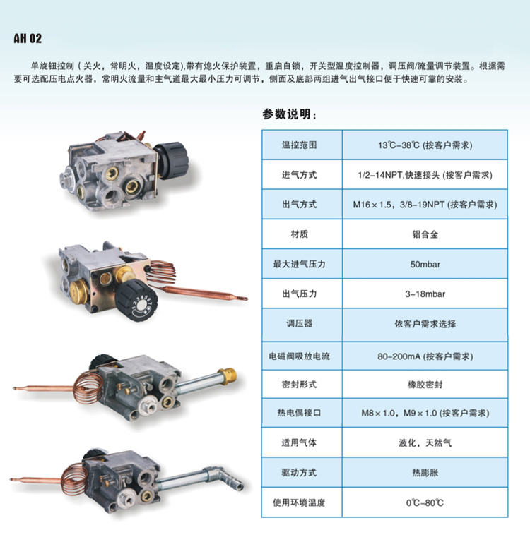 開關(guān)型溫度控制器,調(diào)壓閥/流量調(diào)節(jié)裝置。根據(jù)需要可選配壓電點(diǎn)火器,